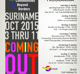 Met als thema ‘Connecting communities beyond borders (verbondenheid)’ wordt van 3 tot en met 11 oktober 2015 de nationale Coming Out Week door het LGBT platform gehouden. Gedurende deze week worden diverse aktiviteiten georganiseerd om Lesbiennes, Gays, Bisexuelen, Transgenders en Interseksuelen (LBGT) in Suriname te versterken. Dit jaar wil het […]